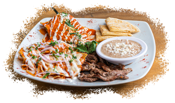 Chilaquiles con carne asada, una quesadilla y un chile relleno