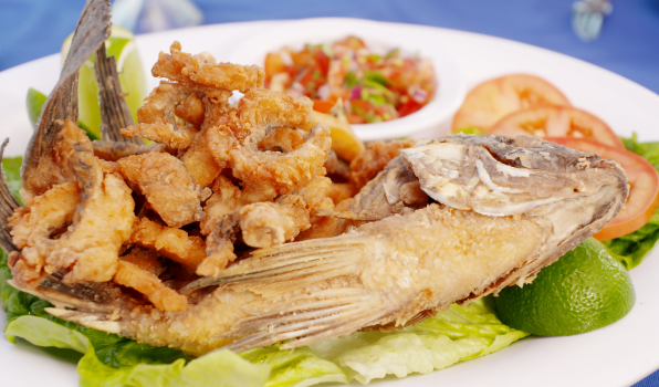 Estrellados con jamón sobre tortilla dorada con frijoles refritos, con salsa ranchera y plátano macho frito